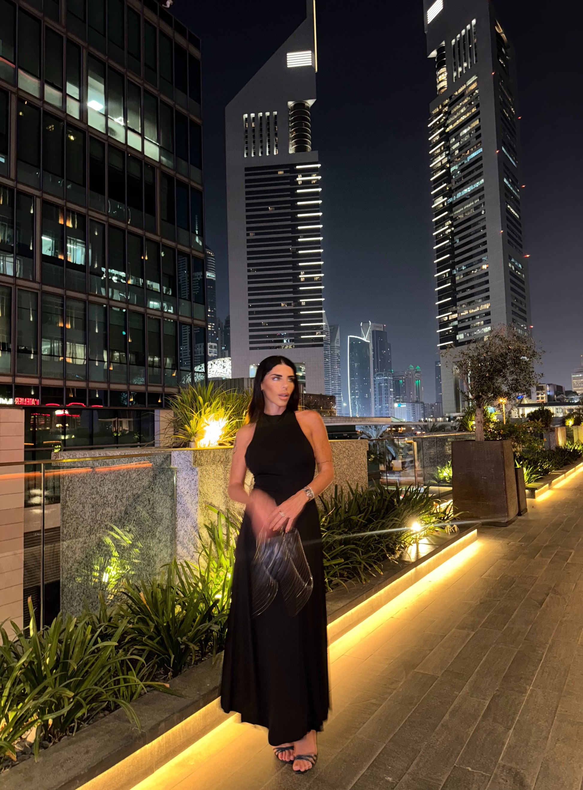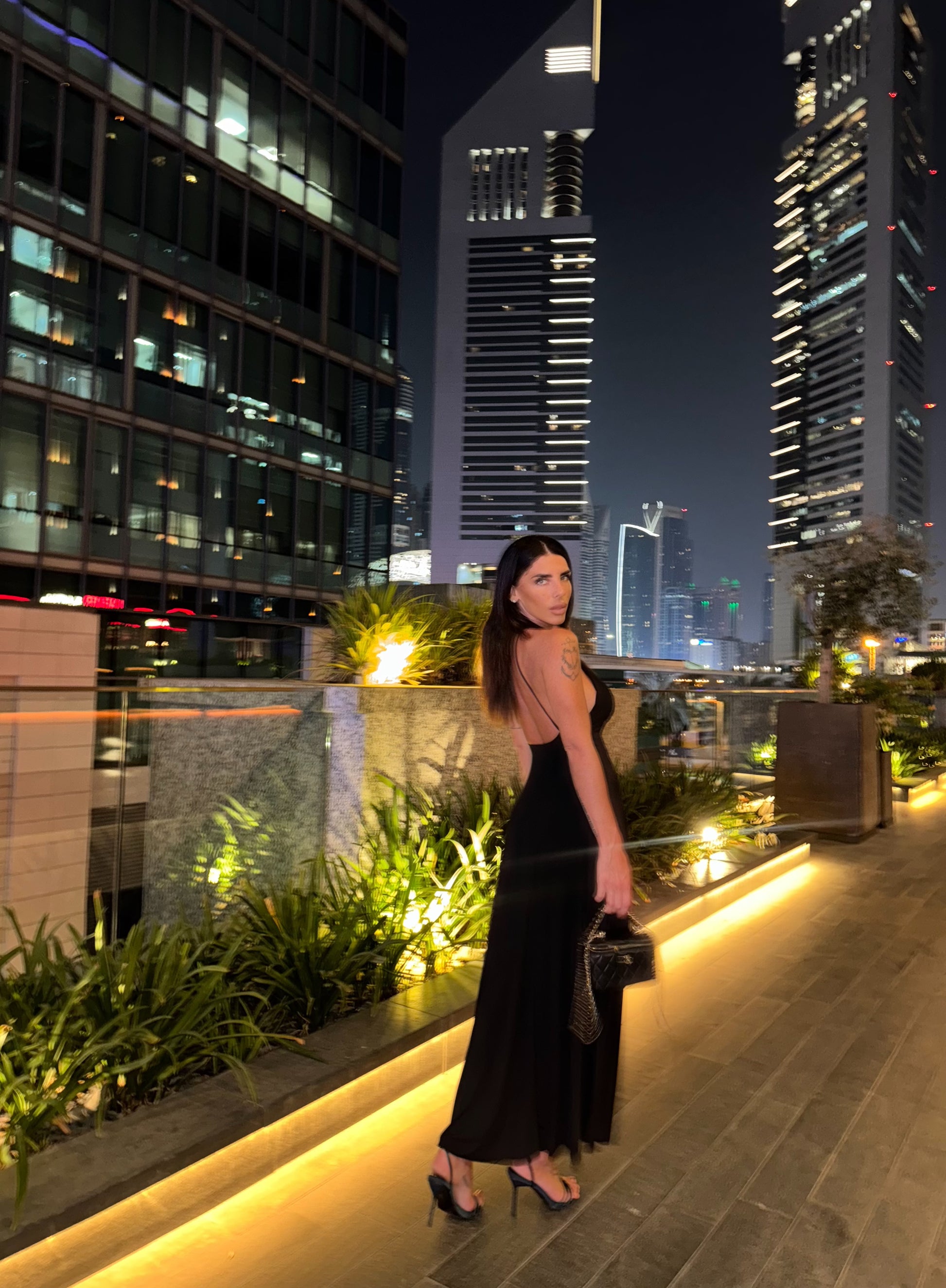 aperto dietro la schiena e chiusura dietro al collo con bottoncini oro