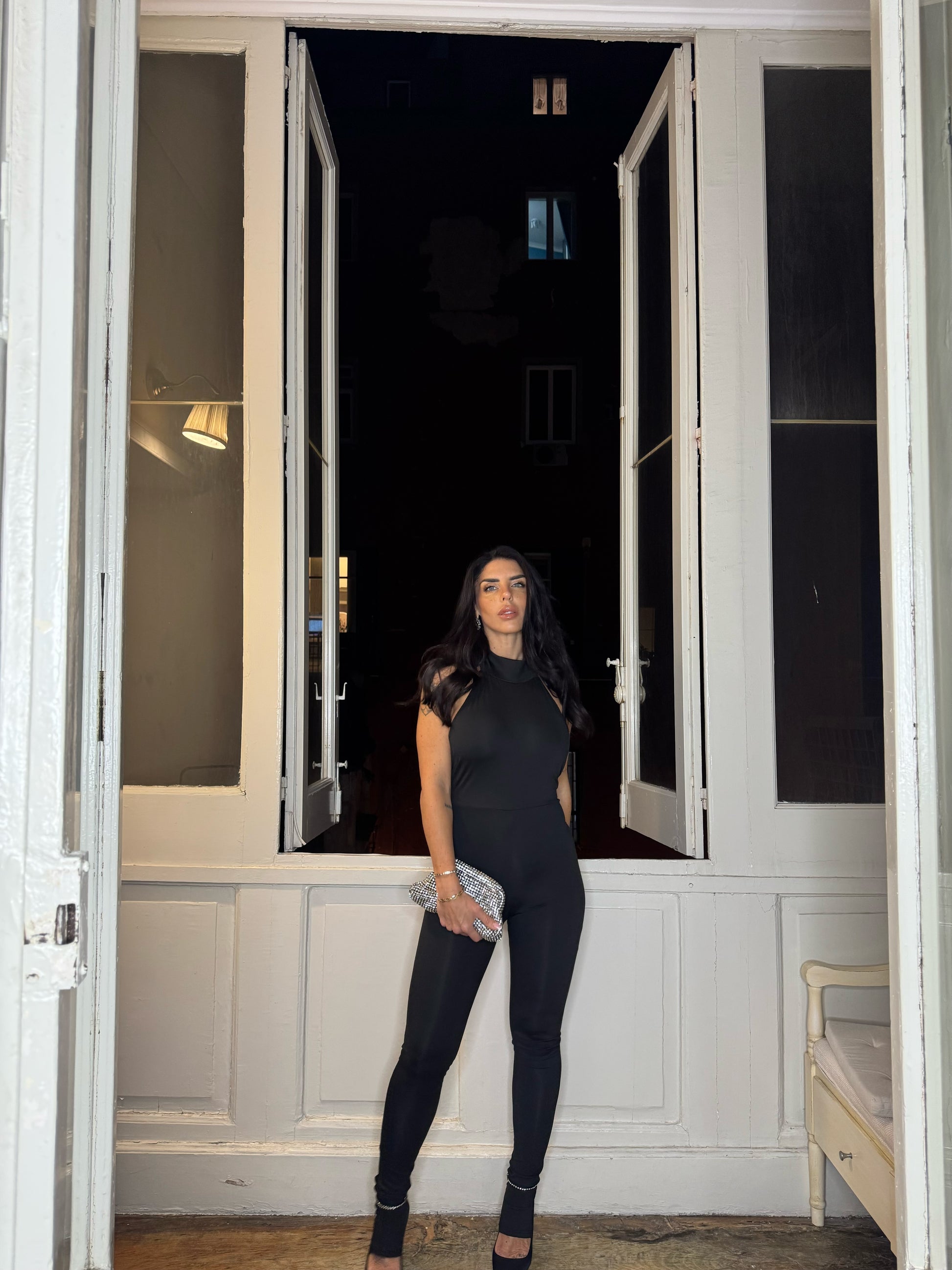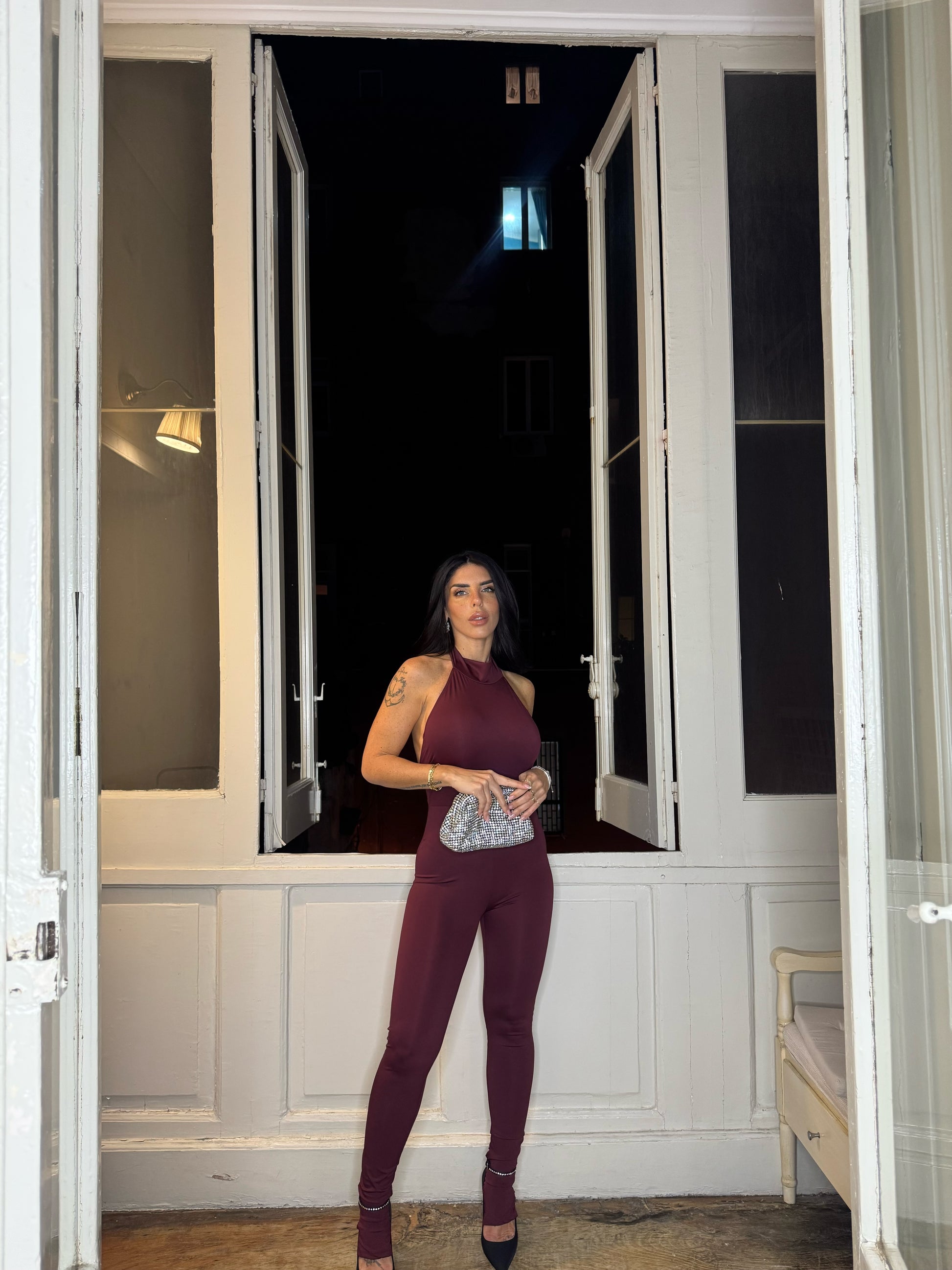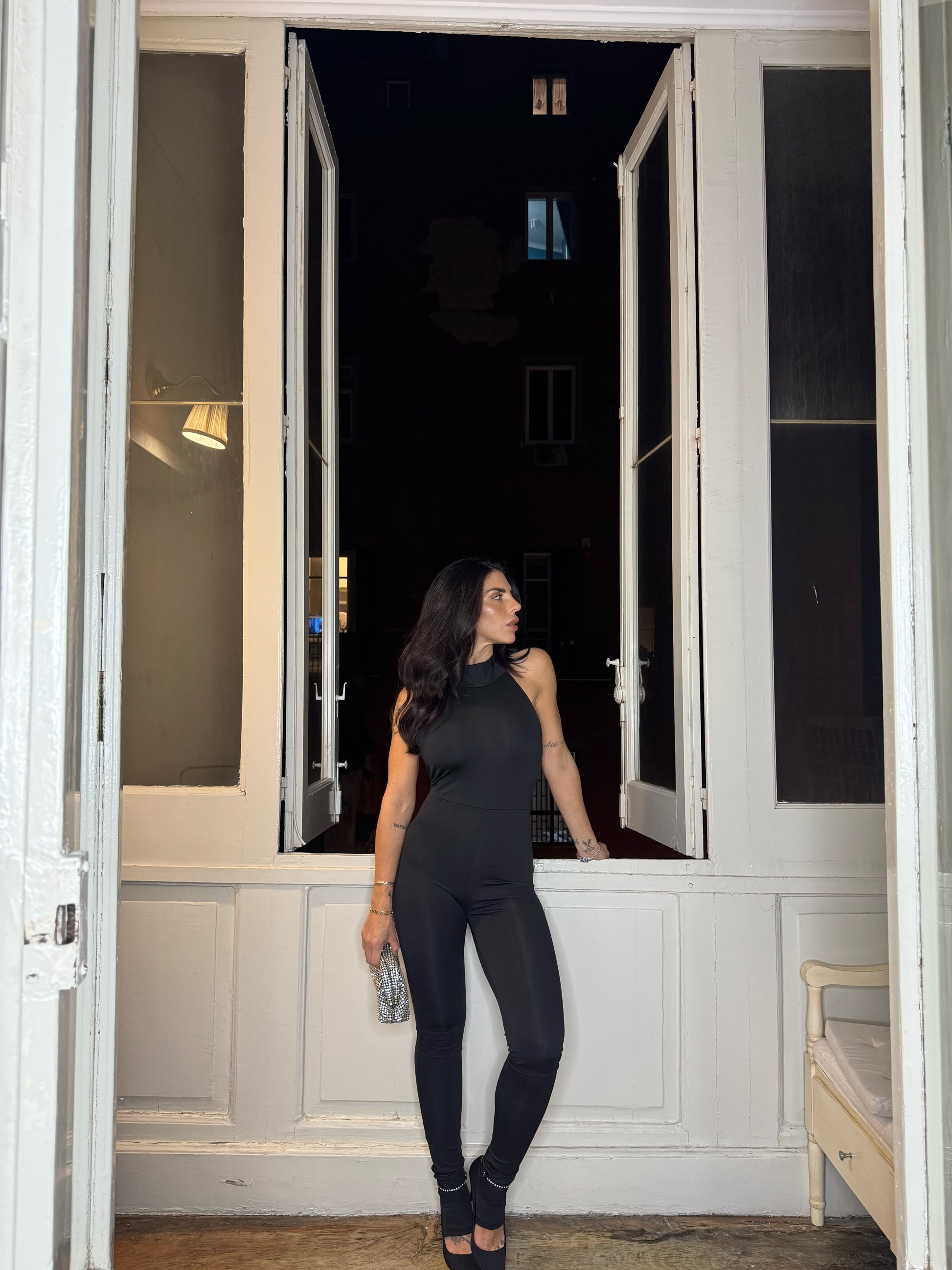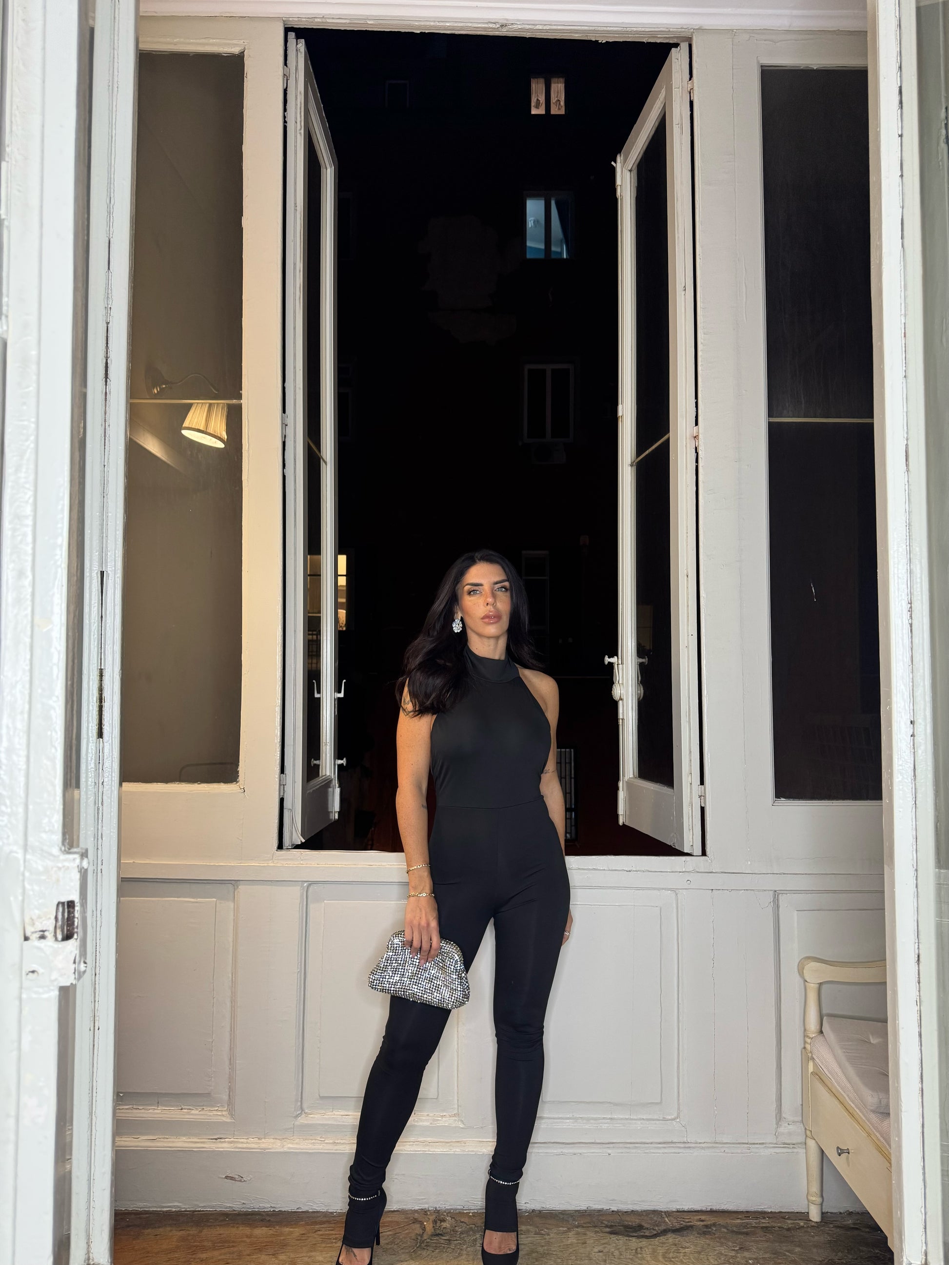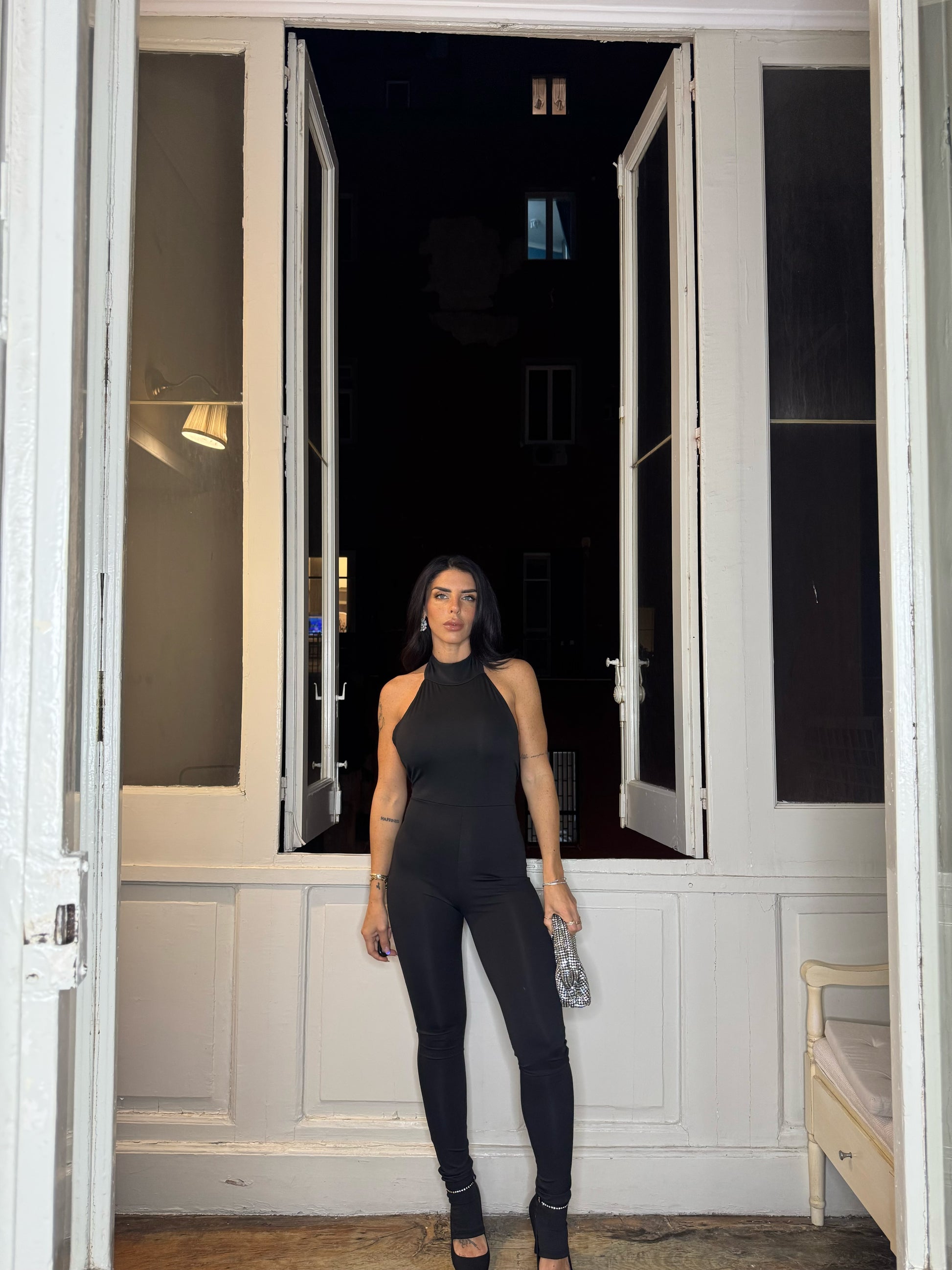 Realizzata in tessuto elastico, che offre una vestibilità aderente e comoda. Presenta una chiusura dietro al collo con bottoni, che aggiunge un tocco di eleganza, mentre la parte posteriore è aperta, creando un effetto sofisticato e sensuale. Disponibile in taglia unica, è pensata per adattarsi a diverse morfologie, offrendo un look chic e moderno.